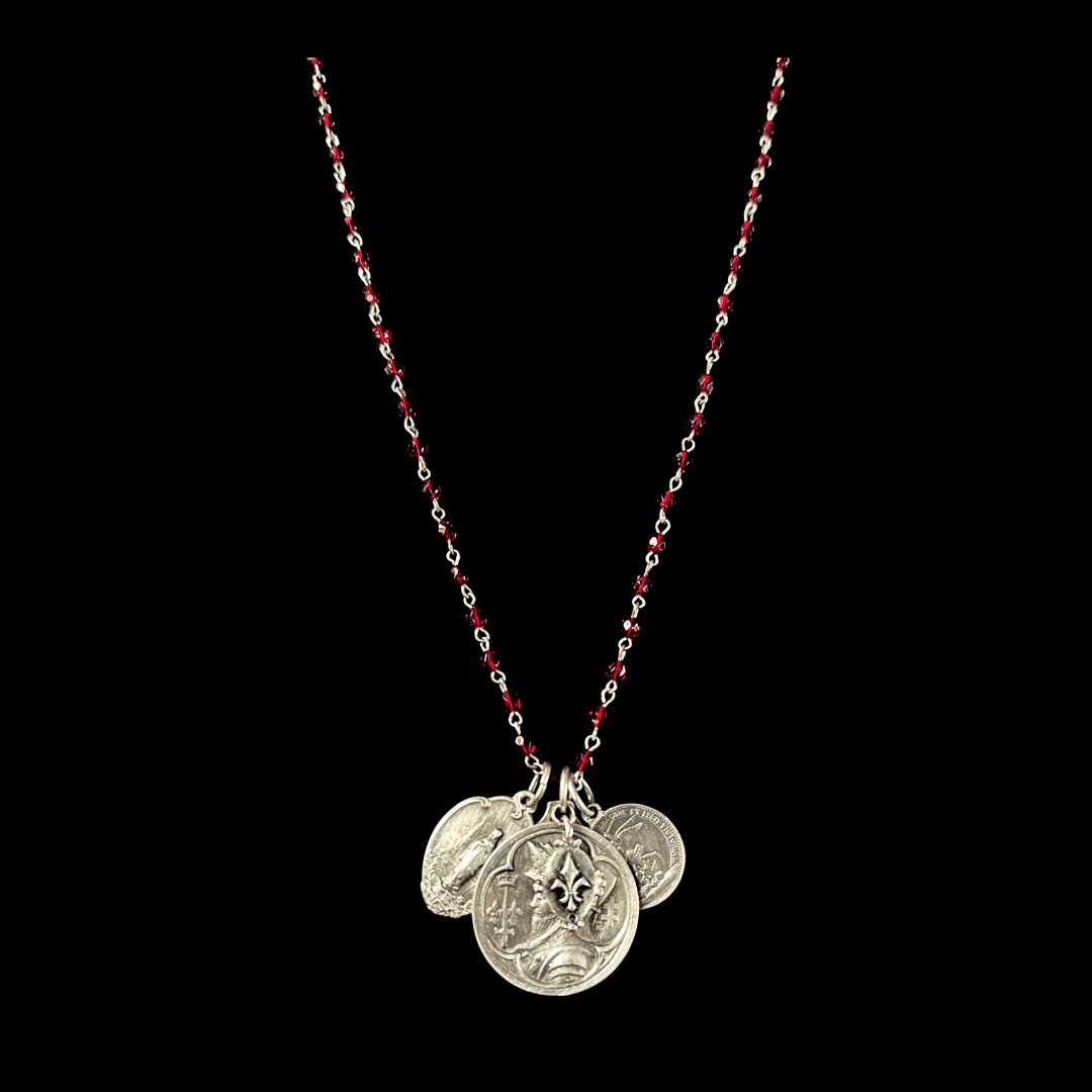 This battle ready devotional mantle honors Joan of Arc as the Bellatrix — the Latin word for female warrior — under the tender and powerful protection of Our Lady of Notre-Dame and the watchful eye of Saint Michael and the loyal friendship of Mary Magdalene. Meticulously recast from French Vintage originals, the medals are removeable and the chain allows new medals to be added. Hand-assembled with Bohemian Garnet Crystal beads, it carries a complete heavenly court of sacred holy medals: Joan of Arc depicted in full armor bearing her sword and the Fleur-de-lis, Our Lady of Notre-Dame, Archangel Michael, St. Mary Magdalene, and delicate Fleur-de-lis accents.